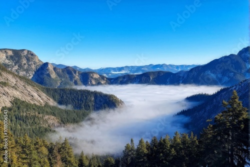 © Katyam1983, Fototapeta premium Misty Valley Surrounded by Majestic Mountain Peaks