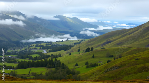 Naklejka premium Misty valleys and verdant hills in the Scottish Highlands.