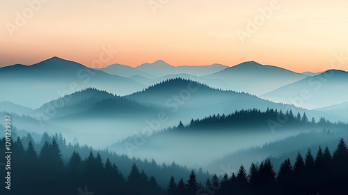 Fototapeta premium Misty watercolor concept. Serene mountain landscape with misty layers and soft pastel sky at dawn.