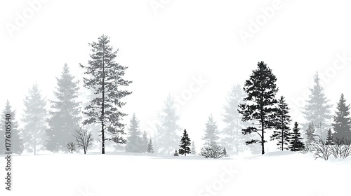 © Yuliia, Naklejka premium Misty winter forest landscape with tall pine trees silhouetted against white fog, creating a serene and atmospheric snowy scene.