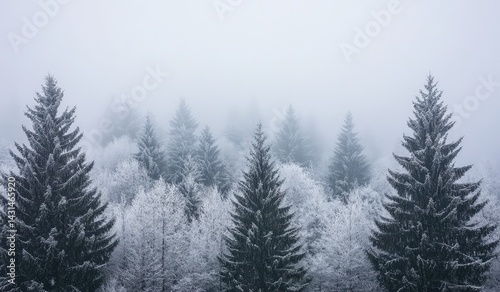 Fototapeta premium Misty winter forest scene with snow-covered evergreen trees