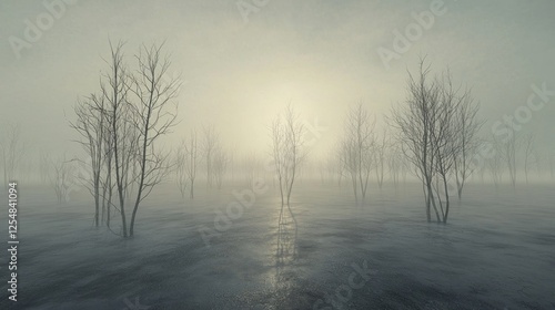Fototapeta premium Misty Winter Landscape: A Surreal Scene of Bare Trees and Fog