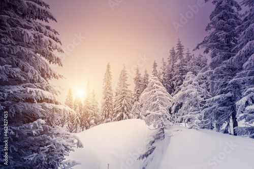Fototapeta premium Misty winter landscape with snowy spruces on a frosty day.