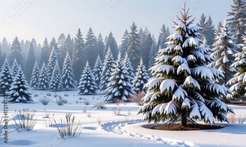 Naklejka premium Misty winter scene with snow-laden evergreen trees, tranquil and serene...