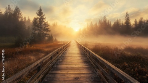 Obraz premium Misty wooden boardwalk at sunrise with pines