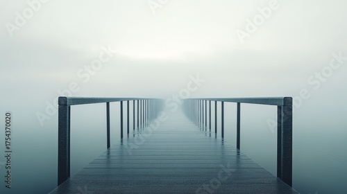 Naklejka premium Misty wooden pier extending into calm water on a foggy morning creating a...
