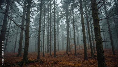 © AkuAku, Fototapeta premium Misty woodland scene on an overcast day, featuring trees and autumn foliage