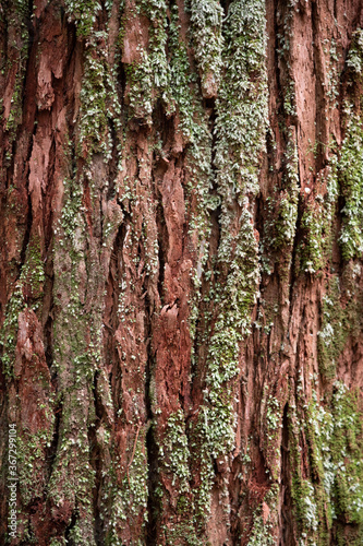 Fototapeta premium Mit grünem Moos bewachsene rotbraune zerfurchte Baumrinde