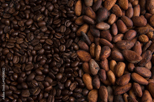 Fototapeta premium Mix of roasted coffee grains with unpeeled cacao grains