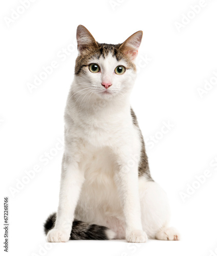 Obraz premium Mixed-breed Cat sitting and looking at the camera, Cat, pet, studio photography, cut out