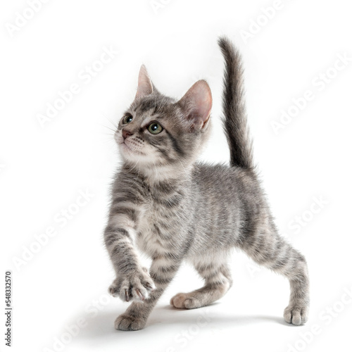 © Elayne, Fototapeta premium mixed breed kitten cat playing in the studio in a white background