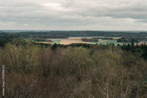 Fototapeta premium Mixed deciduous and pine forest with farmland and infrastructure. High angle...