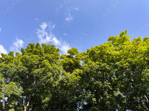 © Lazarenko O., Obraz premium Mixed Forest Trees against Blue Sky with White Clouds