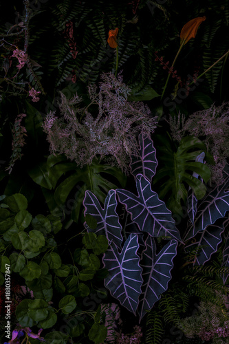 Fototapeta premium Mixed leaves, green leaves, abstract texture, tropical leaves, natural dark...