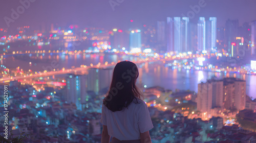 © NzuProd, Fototapeta premium Mixed-Race Couple in Cyberpunk City Nightscape – Modern Tech Lifestyle Photography