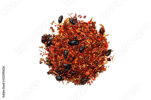 Fototapeta premium Mixed spice with barberry isolated on white background. Top view. Spice mix for pilaf