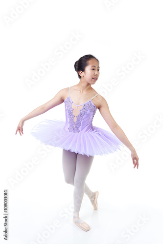 © ronniechua, Naklejka premium Młoda azjatycka balerina z szelkami w pozie tanecznej