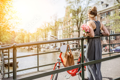 Fototapeta premium Młoda i piękna kobieta stojąca z rowerem i kwiatami na moście nad kanałem wodnym w mieście Amsterdam
