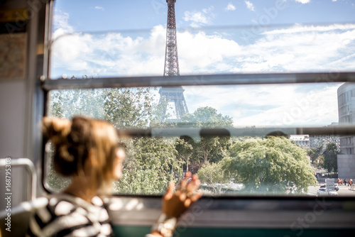© rh2010, Obraz premium Młoda kobieta, patrząc na wieżę Eiffla przez okno pociągu w Paryżu. Obraz skupiony na tle