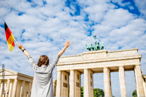 © rh2010, Obraz premium Młoda kobieta turysta stojąc z podniesionymi rękami i niemiecką flagą przed słynną bramą brandenburską w Berlinie