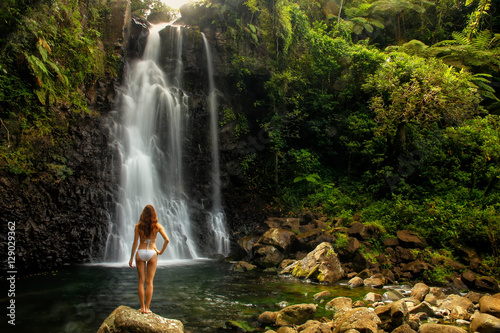 © donyanedomam, Fototapeta premium Młoda kobieta w bikini pozyci Środkowymi Tavoro siklawami w Bo