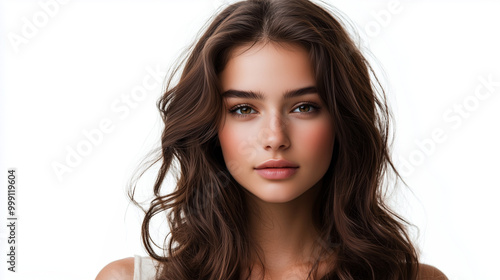 Naklejka premium Młoda kobieta z długimi, falującymi włosami, które swobodnie opadają na ramiona.