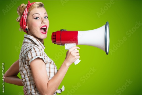 © BillionPhotos.com, Naklejka premium Młoda piękna blondynki kobieta z głośnikiem