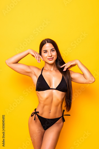 © F8 \ Suport Ukraine, Naklejka premium Młoda seksowna szczupła opalona kobieta w czarnym stroju kąpielowym, pozowanie na żółtym tle.