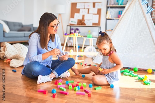 © Krakenimages.com, Fototapeta premium Młoda terapeuta mówi i leczy dziecko, doradca i korekta zachowania w kasie pedagoga, robi notatki na schowku
