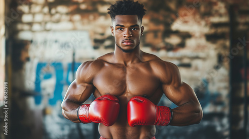 Obraz premium Młody bokser z wyrazistą muskulaturą, ubrany w czerwone rękawice, stojący w...