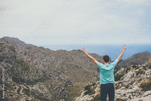 © kegfire, Obraz premium Młody człowiek stojący na klifie z rękami wzniesionymi na szczycie góry i patrząc na wzgórza Sa Colobra, Majorka, Hiszpania