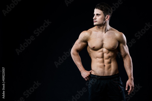 © romankosolapov, Fototapeta premium Młody i sprawny model mężczyzna pozowanie jego mięśnie patrząc w lewo na białym tle na czarnym tle z lato