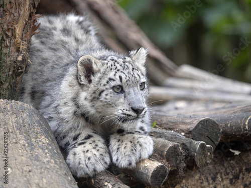 © vladislav333222, Obraz premium młody lampart śnieżny, Uncia uncia obserwująca otoczenie