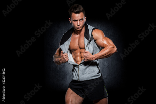 Naklejka premium Młody przystojny kulturysta atleta, w pięknym stroju sportowym, pokazuje mięśnie brzucha na ciemnym tle. Koncepcja - siła, uroda, bicepsy, triceps, sprzęt sportowy, siłownia, odżywianie sportowe.