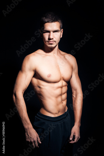 © goami, Fototapeta premium młody przystojny mężczyzna z doskonałym tułowiem na czarnym tle;