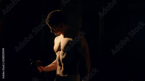 Fototapeta premium Mman with well trained body, biceps, abs and pecs make exercise with dumbbell
