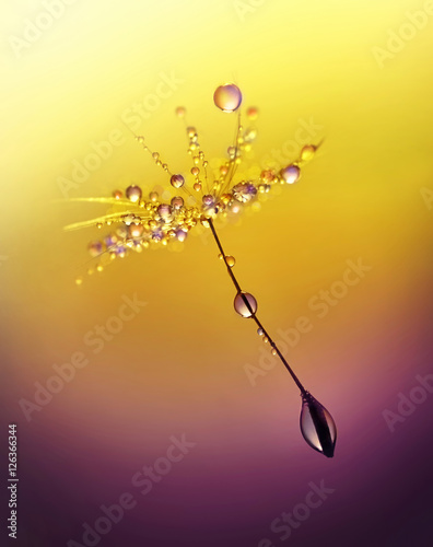 Fototapeta premium Mniszek lekarski z kroplami rosy w kolorze złotym. Piękny złoty mniszek z kropli wody. Nasiona mniszka lekarskiego z rosą na pięknym złotym tle.