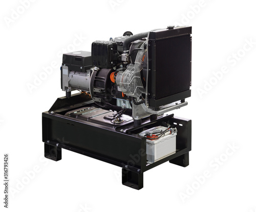 © kurtov, Fototapeta premium Mobile, portable mobile diesel or gasoline generator, black, with remote control, isolated on white background.