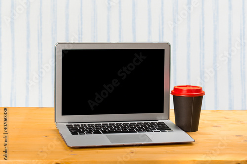 Fototapeta premium mocap Laptop with blank screen for product display and coffee on a wooden table.