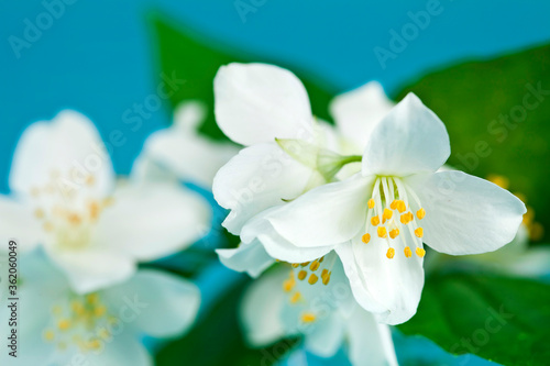 Fototapeta premium Mock-orange (Philadelphus) flowers on a blue background.
