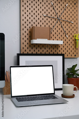 © Prathankarnpap, Obraz premium Mock up computer laptop with blank screen and office supplies on white desk at modern home office.