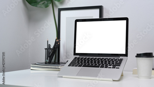 © Prathankarnpap, Fototapeta premium Mock up computer laptop with blank screen, pencil holder, coffee cup, notebook and empty photo frame on modern workplace.