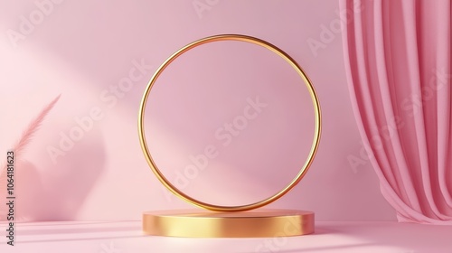 © hugy, Obraz premium Mock up 3d rendered illustration with geometric shapes golden cylinder podium platforms for cosmatic product presentation. circle design empty space. Abstract composition in pink pastel modern style