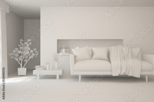 © AntonSh, Fototapeta premium Mock up of minimalist living room in white color with sofa. Scandinavian interior design. 3D illustration