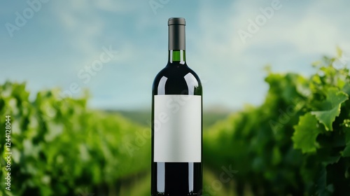 Fototapeta premium Mock up of wine bottle surrounded by lush vineyard landscape during daylight hours