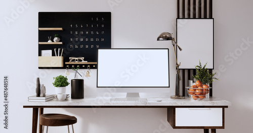 © Interior Design, Fototapeta premium Mock up office table desk. blank computer screen in office modern room. 3d rendering