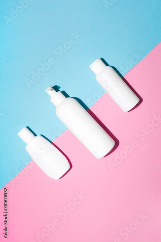 © Margarita Ratatosk, Fototapeta premium Mock up pattern for branding on pastel pink and blue background. Tubes, dispensers and jars. Branding identity mockup concept. Flat lay top view
