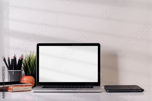 © NAMPIX, Fototapeta premium Mockup blank screen laptop computer and supplies on white table.