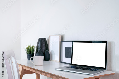 © NAMPIX, Obraz premium Mockup blank screen laptop computer on white top table with copy space.