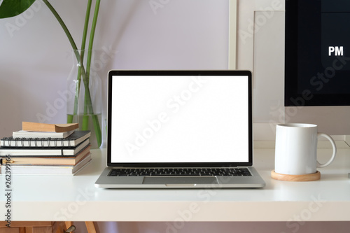 Fototapeta premium Mockup blank screen laptop on white workspace